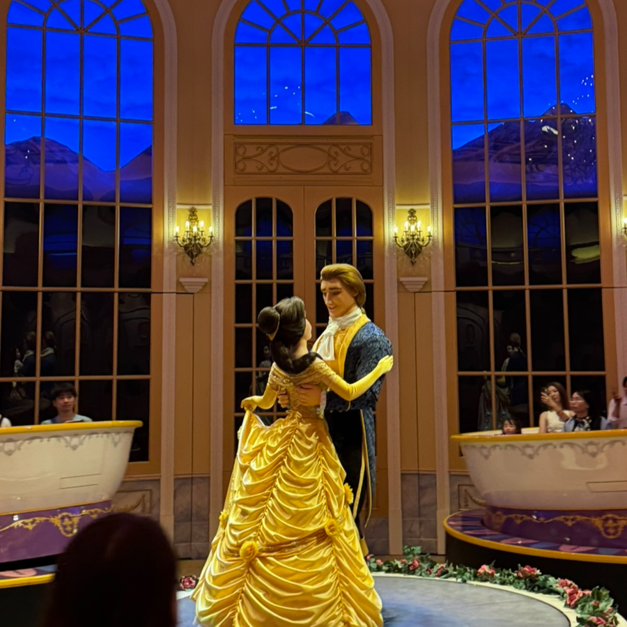 위에서 소개드린 푸의 허니헌트 못지않게 인기있는 놀이기구인 미녀와 야수입니다. 해당 놀이기구는 PP패스는 사용불가하며, 유료 패스트 패스인 DPA 사용이 가능합니다 1인당 2만원정도의 금액으로 패스트패스 구입이 가능하며, 디즈니랜드 어플 통해 구입이 가능합니다. DPA 구입없이 탑승하시려면 웨이팅이 길기 때문에 DPA 구입 후 탑승을 추천드리는 놀이기구 입니다. 이 놀이기구 역시 푸의 허니헌트와 마찬가지로 바닥의 트랙레일이 보이지않아 재미있게 탑승가능하고, 미녀와야수의 파티에 초대된 채 함께 파티를 즐기는듯 생동감 넘치는 놀이기구라 추천합니다.